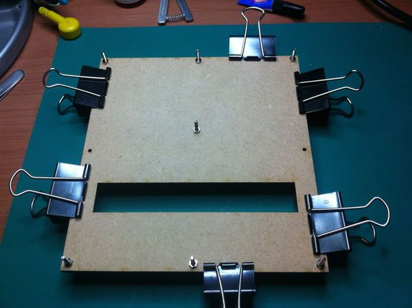 We used Loctite Mini as glue, but any glue should do. After applying the glue to the back side of the top layer we put on the bottom and secured the screws. We put some clamps on to hold the panels properly together while the glue cured.